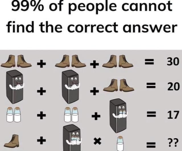 Are you ready to test your math skills with a fun and challenging puzzle? This tricky equation has left 99% of people scratching their heads. Can you figure it out and explain your answer? Your mission: assign the correct values to shoes, a fridge, and milk bottles to uncover the final answer. Take a closer look and be careful—tiny details can change everything. Share your answer and see how you stack up against other calculation geniuses!
