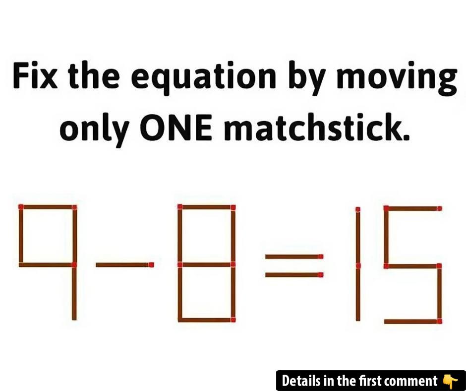 Can you solve this tricky puzzle in under 20 seconds? The equation looks wrong, but with just one move, you can make it correct. The challenge: move only one matchstick to fix the equation! It might sound simple, but many people get stuck by overthinking the solution. Can you spot the right move and explain how you did it? Take the challenge, solve it, and share your answer in the comments below! Let’s see who gets it first!