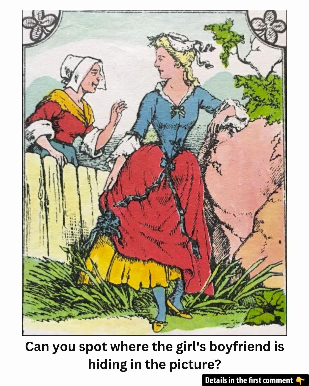Think you have perfect vision? Put your eyes to the test with this charming vintage illustration of a young woman chatting over a fence. Hidden somewhere in the scene is her boyfriend, and spotting him isn’t as simple as you might think. His clever camouflage has baffled countless onlookers, who often miss the subtle details that reveal his whereabouts. Are you confident you can find him before reading the solution? Dive into this intriguing puzzle, see if your observational skills stand up to the challenge, and discover how quickly you can solve the mystery!